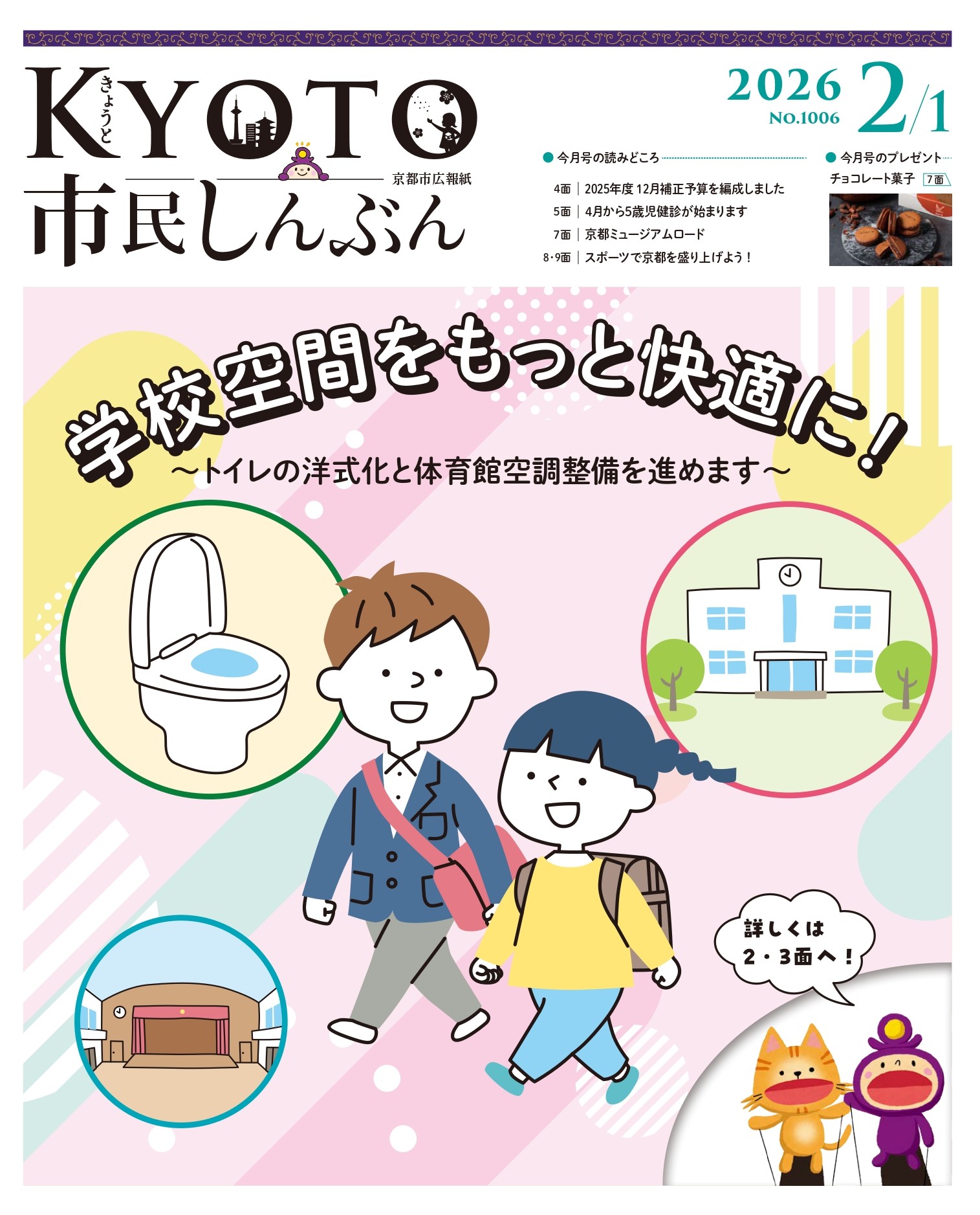 市民しんぶん 2月1日号は、京都市が学校施設の機能と魅力向上のため、さまざまな施設の改修を行ってきたうち、トイレの洋式化と体育館の空調整備の2つを紹介。