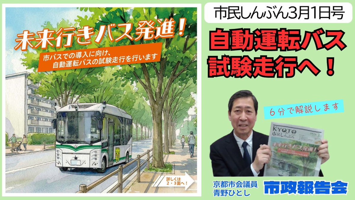 公明党京都市会議員団は、市民しんぶんで指摘されたバス運転士不足や郊外路線維持の課題に対し、自動運転技術導入を後押ししてきました。