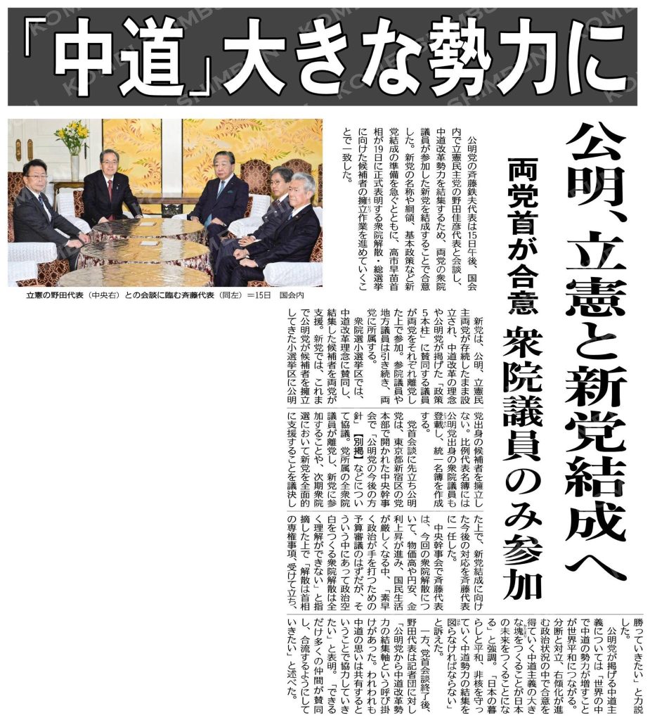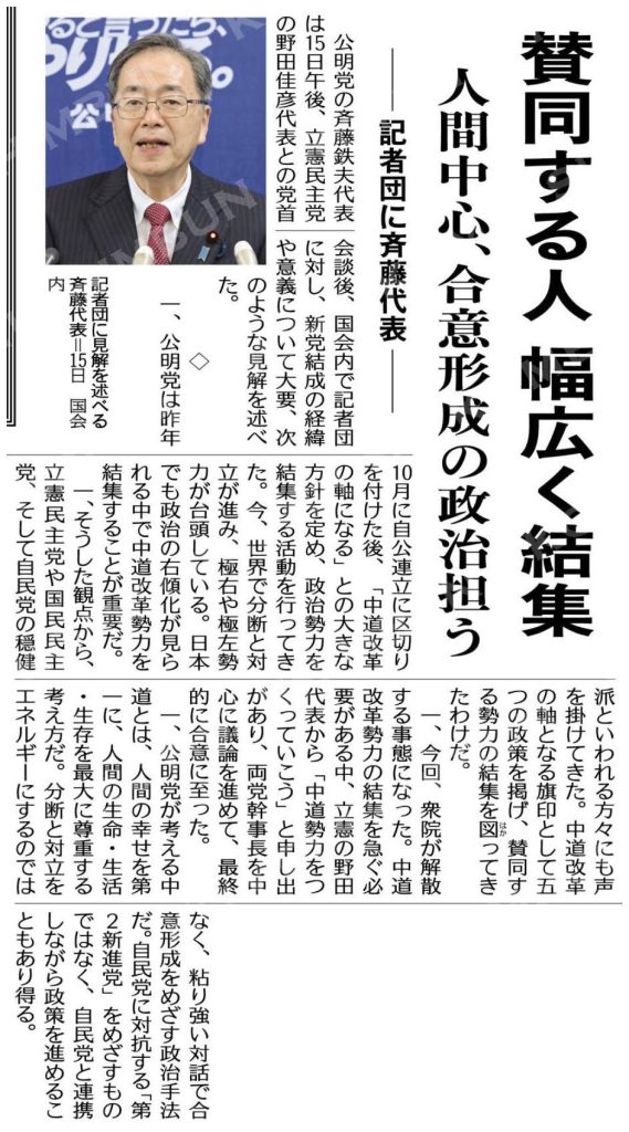 🔸公明党の斉藤鉄夫代表は、立憲民主党・野田佳彦代表らとの協議で、立憲と新党の結成を軸に「中道改革」を掲げた新たな政治勢力づくりを進める考えを示しました。