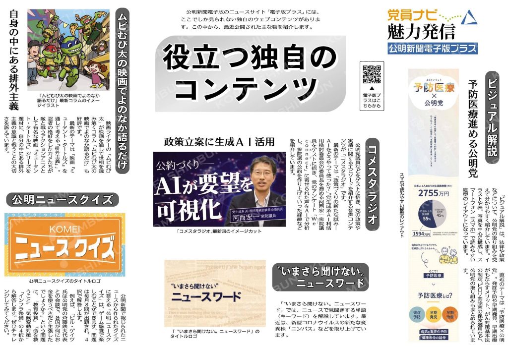 《党員ナビ 魅力発信》 役立つ独自のコンテンツ ! 【公明新聞より】9/29付 4面 公明新聞電子版「プラス」では、AIによる政策立案支援やビジュアルでの政策解説、ユニークな映画コラム、時事用語の解説やニュースクイズなど、多彩かつ独自のコンテンツが提供されています。 デジタルツールの積極的な活用により、政策提案や市民への情報発信を一層分かりやすく魅力的に進め、公明党の取り組みを効果的に伝えていく決意です