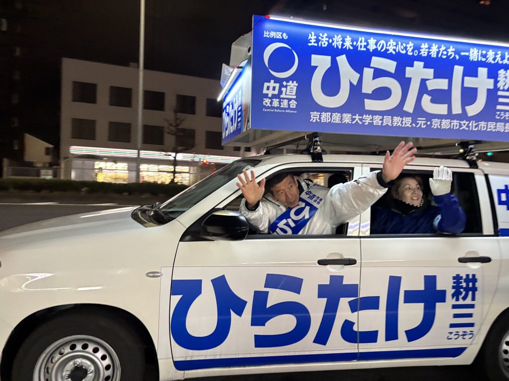 ひらたけ耕三 最後のスポット遊説! 中道改革連合 京都1区 ひらたけ耕三 候補が堀川三条で、最後のスポット遊説を行いました。寒い中、お忙しい時間帯にも関わらず、たくさんの方から熱い声援が寄せられました。 ひらたけ候補は「生活者ファーストの政治を!」「日本の政治を守り抜く!」と力強い訴え。 本日2/7も最後の最後まで頑張りぬいてまいります! 投票は1枚目「ひらたけ耕三」 2枚目「中道」、よろしくお願いします!