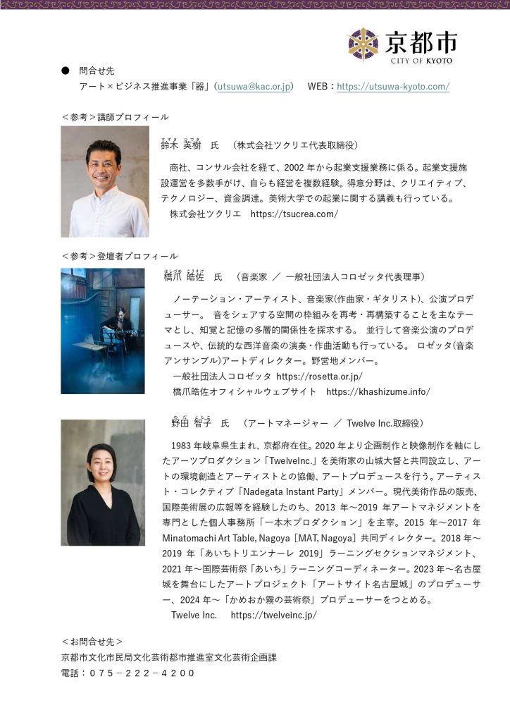 京都芸術センター内の「アート×ビジネス共創拠点『器』」では、アートワーカー(アーティスト、アートマネージャー等)を対象に、起業や資金調達、社会とのつながり方を学ぶ実践的な講座を開催します。