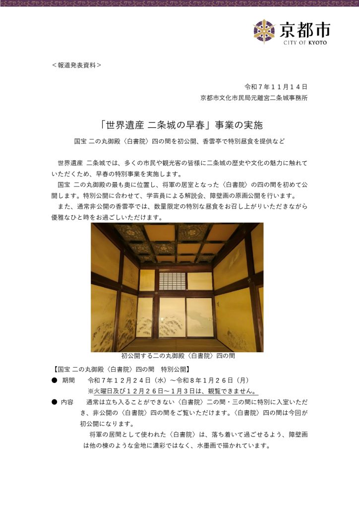 世界遺産・二条城で「早春」の特別事業が開催されます。