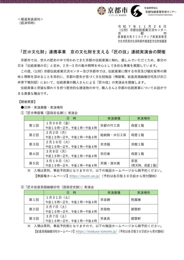 🔸 岩倉具視幽棲旧宅 (事前予約):1/31京金網、2/7京指物、3/7京表具