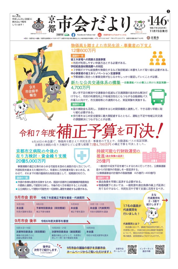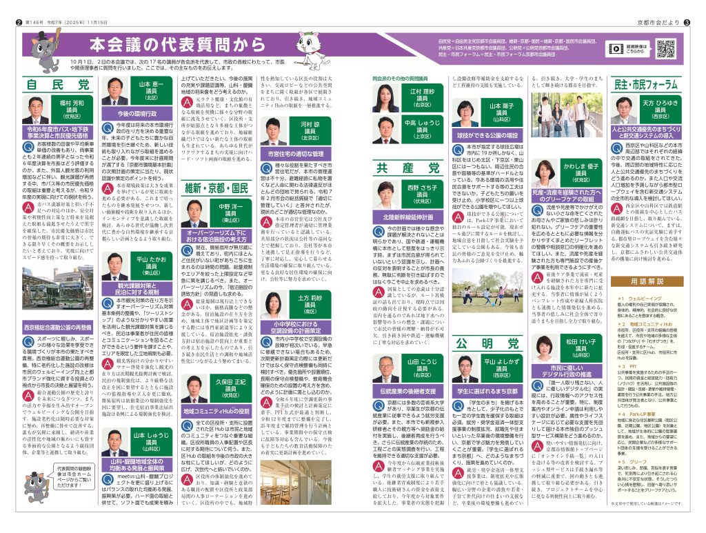 11月15日号では9月市会前半の内容について、1面で 令和7年度補正予算 の内訳や議論の一部を掲載。2~3面には本会議の代表質問の主なものが、4面には私も参加した常任委員会の他都市調査レポートが委員会別にまとめられています。