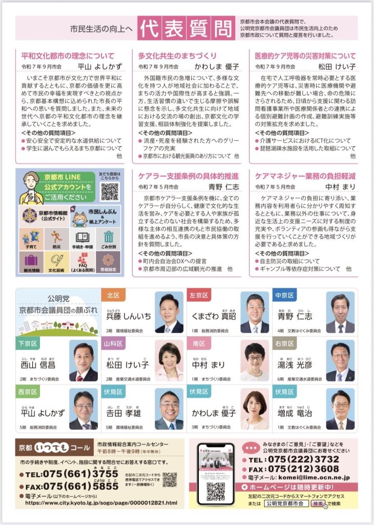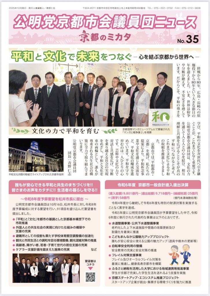 私が団長を務める公明党京都市会議員団の最新ニュース「京都のミカタ」35号が完成。 今号では、「平和と文化で未来をつなぐ」をテーマに、平和文化都市としての京都の発信や、令和8年度予算要望、令和6年度決算のポイントなどをわかりやすく紹介しています。裏面には、私 青野ひとし が令和7年5月市会で代表質問した内容を掲載。代表質問の要点は、こちらのショート動画でもご覧いただけます。