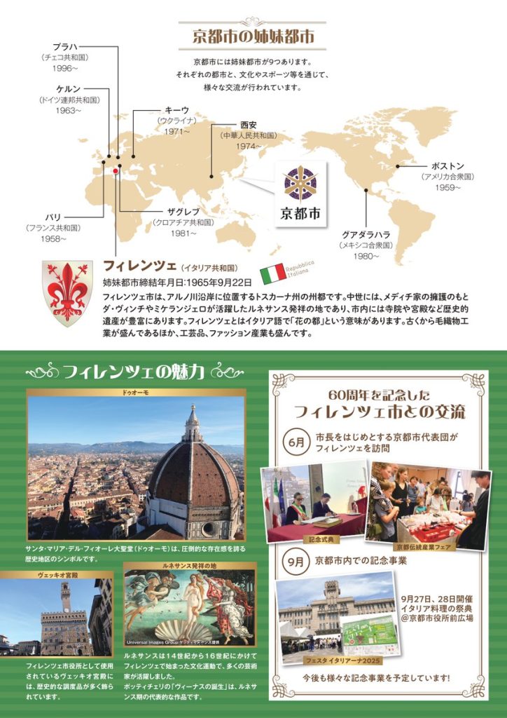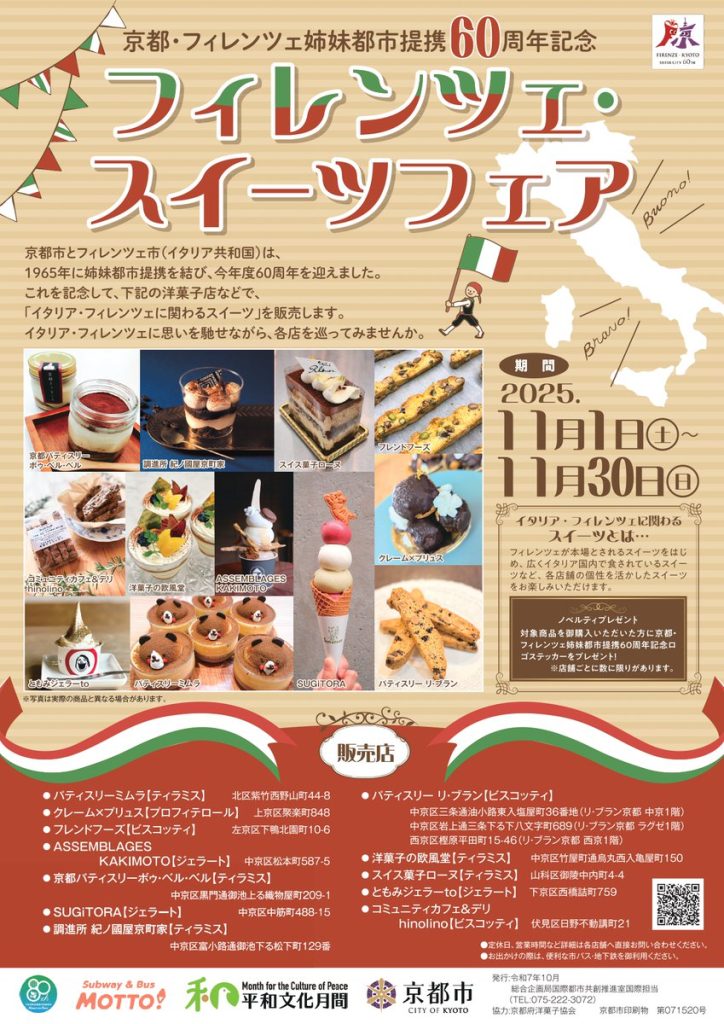 京都市とフィレンツェ市の姉妹都市提携60周年を記念して「フィレンツェ・スイーツフェア」が開催されます。市内の洋菓子店等で、イタリア・フィレンツェゆかりのスイーツを11月1日~30日の期間限定で販売。フェアならではのプレゼント企画も実施しています。京都とフィレンツェの両都の歩みに思いを馳せつつ、秋の味覚をご堪能ください! 販売期間:11月1日(土)~30日(日) 場所:市内洋菓子店(詳細は公式HP・チラシ参照) 内容:#ティラミス、ジェラート、ビスコッティ等のスイーツ販売 詳しくは京都市HPもしくはチラシをご覧ください https://city.kyoto.lg.jp/sogo/page/0000344759.html