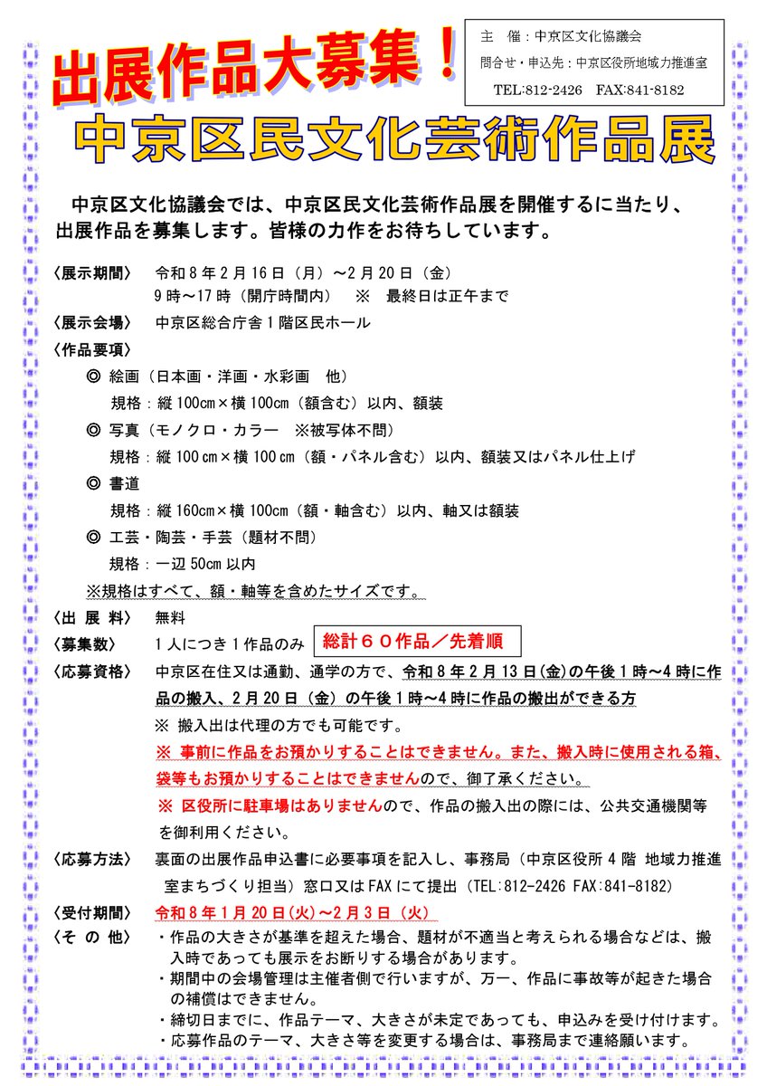 中京区民文化芸術作品展 開催!中京区民の絵画・写真・書道・工芸作品を募集。地域の才能を発信しましょう! 🔸展示期間:2/16(月)〜2/20(金)9:00〜17:00(最終日12:00まで)🔸場所:中京区役所1F区民ホー… 続きを読む 中京区民文化芸術作品展 開催!