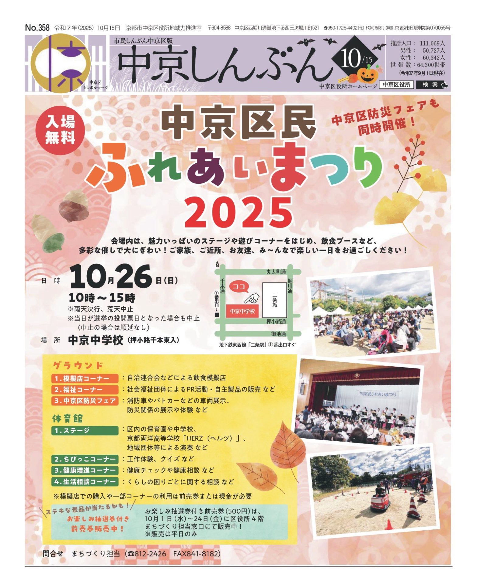 中京しんぶん 最新号10月15日号は、中京区民ふれあいまつり2025 を紹介! 当日10/26の会場内は、魅力いっぱいのステージや遊びコーナーをはじめ、飲食ブースなど、多彩な催しで大にぎわい!ご家族、ご近所、お友達、み~… 続きを読む 中京しんぶん ー中京区民ふれあいまつり2025 を紹介!