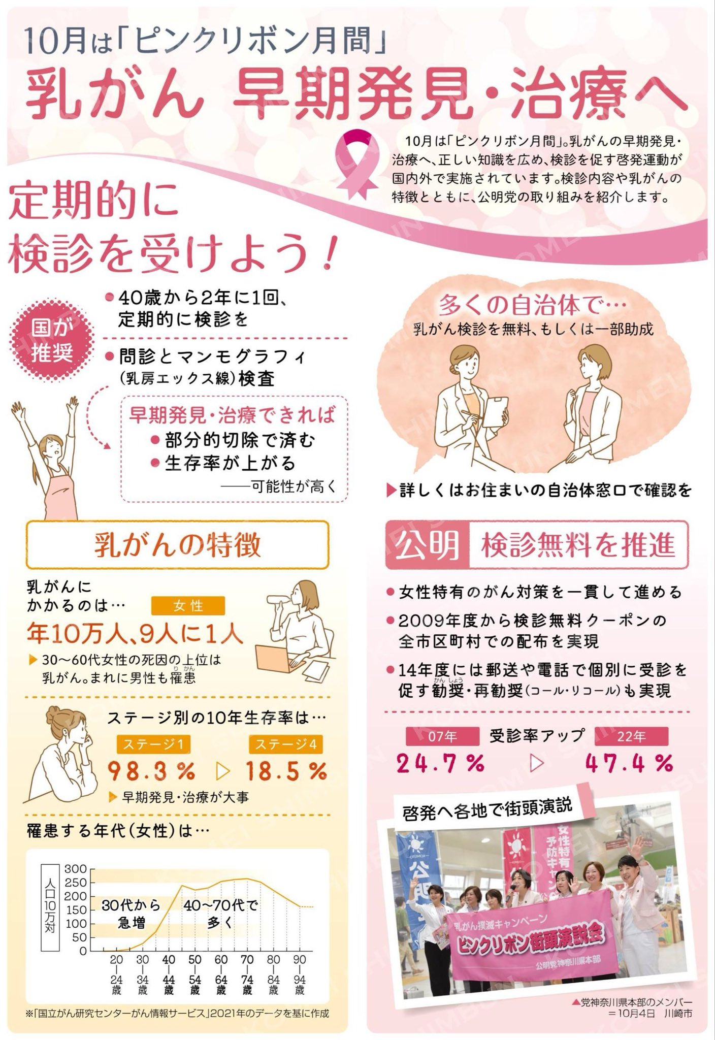 【公明新聞より】10/10付 3面 《レッツシェアKOMEI❗️》乳がん早期発見・治療へ/10月は「ピンクリボン月間」 🔶10月は「ピンクリボン月間」で、乳がんの早期発見と治療の重要性を啓発しています。🔶国は40歳以上の… 続きを読む 乳がん早期発見・治療へ