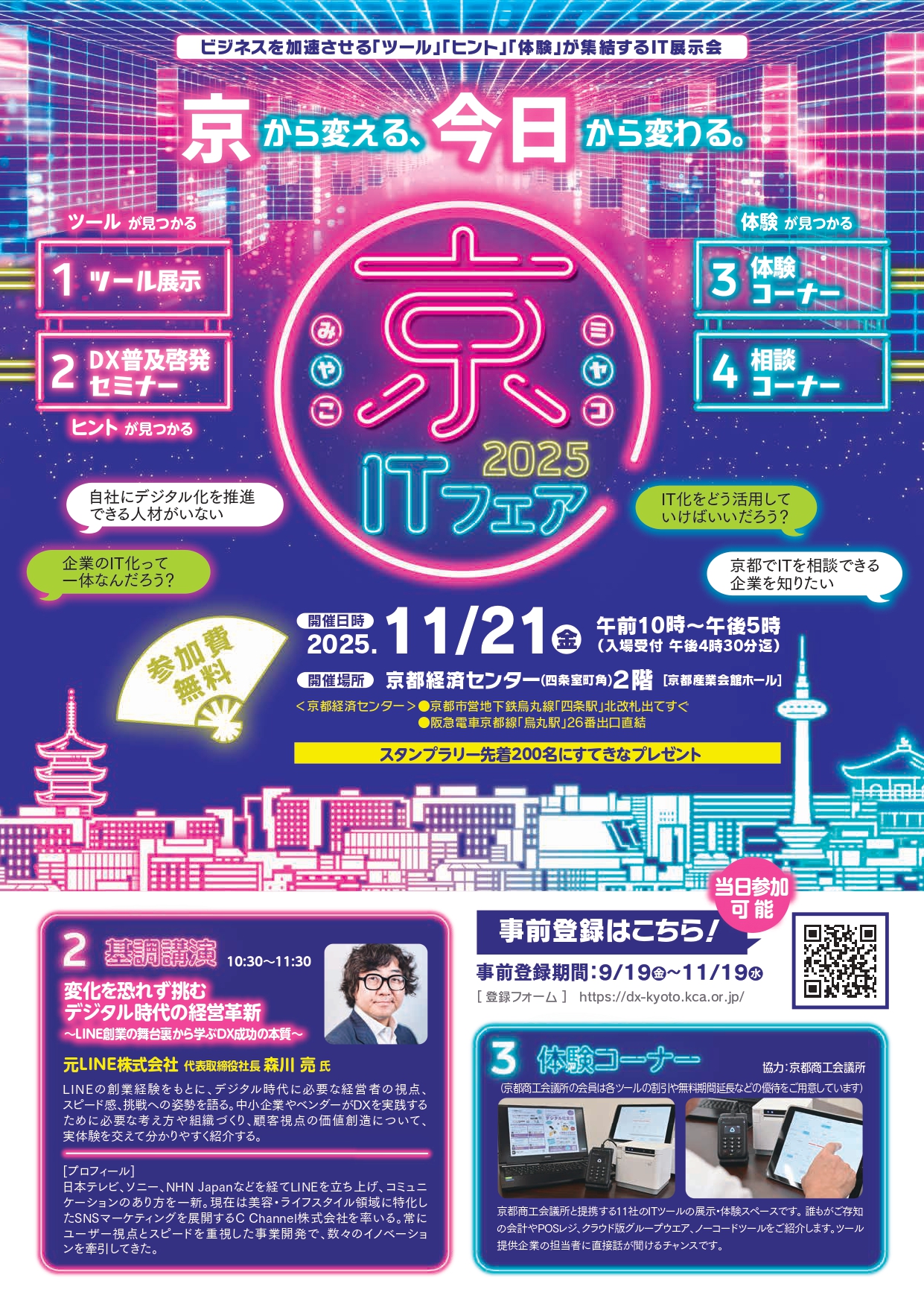 京都市主催「京(みやこ)ITフェア2025」が11月21日(金)京都経済センターで開催されます。 中小企業の デジタル化・DX推進 を支援する展示会で、ITツールの体験、セミナー(元LINE社長の基調講演)、相談コーナー… 続きを読む 11月21日(金)「京(みやこ)ITフェア2025」開催!