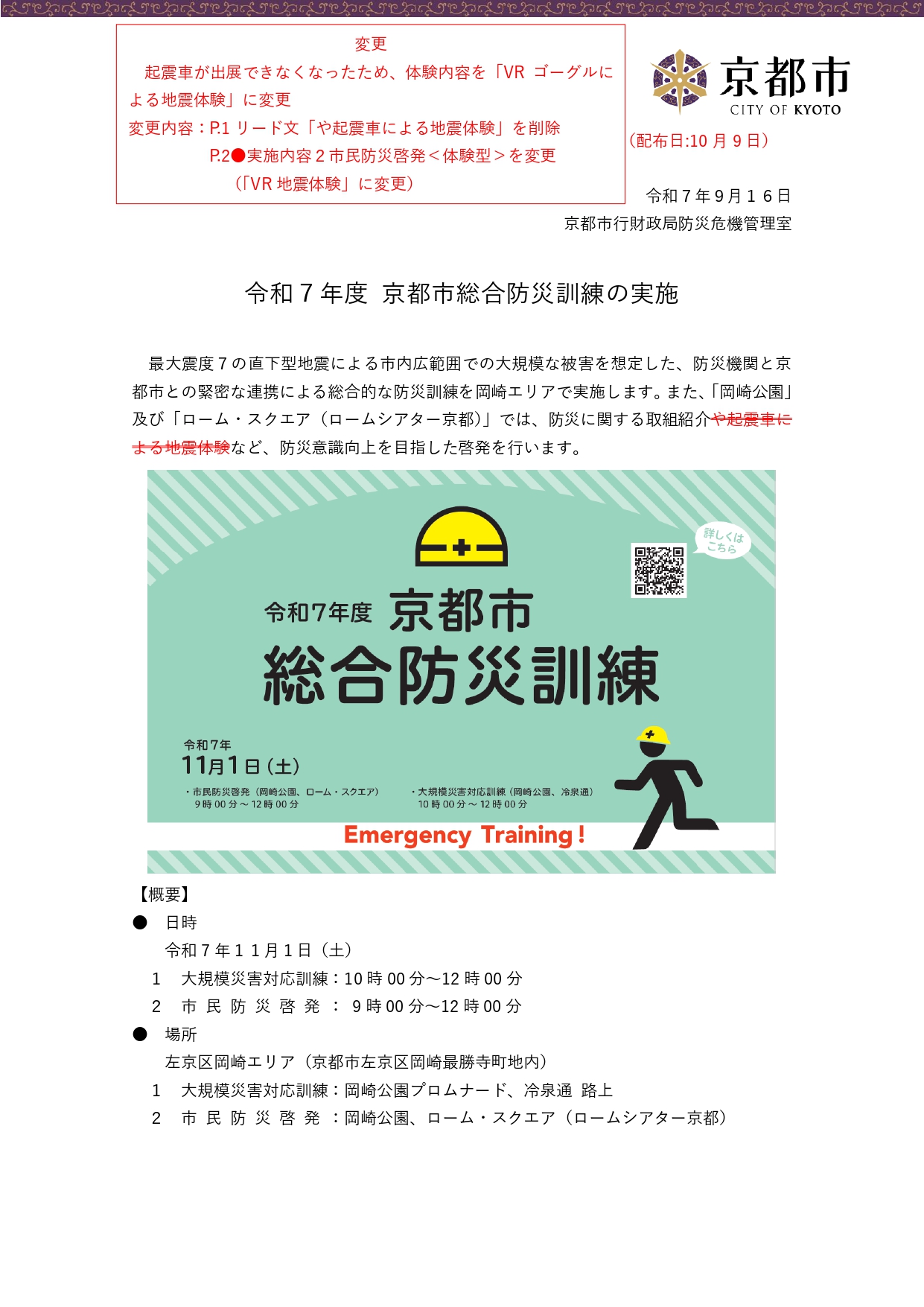 令和7年度 京都市総合防災訓練 が11月1日(土)岡崎エリアで開催されます。最大震度7の 直下型地震 発生を想定し、関係機関による大規模災害対応訓練や、住民向けの防災啓発ブース(体験型・VR地震体験、心肺蘇生法講習ほか)… 続きを読む 岡崎エリアにて京都市総合防災訓練、開催