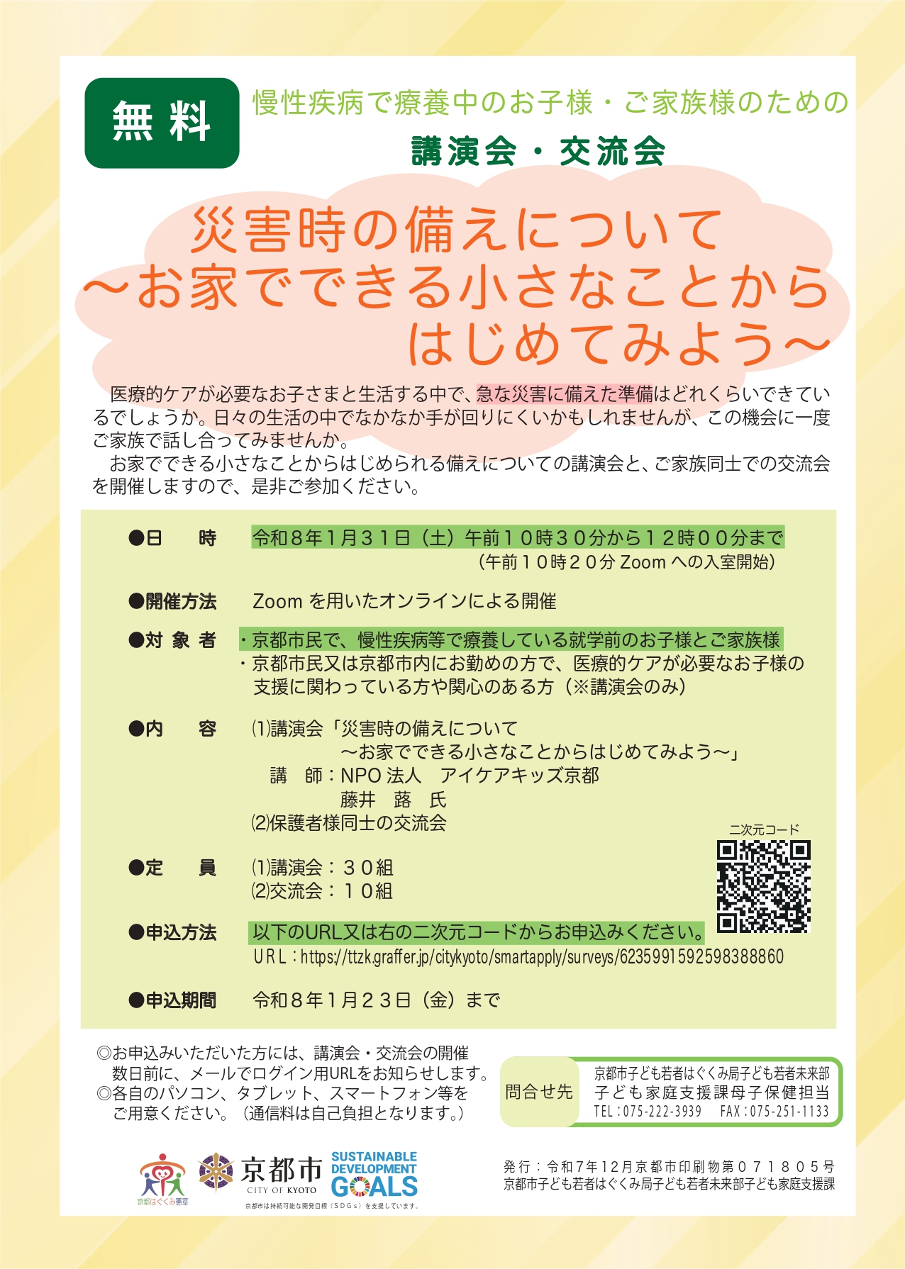 京都市が、慢性疾病で療養中のお子さんとご家族のためのオンライン講演会・交流会「災害時の備えについて~お家でできる小さなことからはじめてみよう~」を開催します。🔸日時:令和8年1月31日(土)10:30~12:00(講演+… 続きを読む 京都市が、慢性疾病で療養中のお子さんとご家族のためのオンライン講演会・交流会を開催